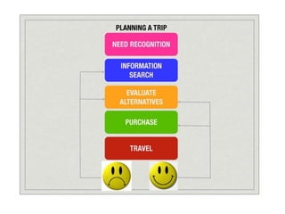 The document discusses how digital travel is changing and consumers now expect more personalized experiences. It emphasizes that companies need strong, unique messaging to stand out. It also stresses the importance of understanding different types of travelers and profiling typical customers. Companies should focus on optimizing their online presence, social media engagement, and conversion points to drive traffic and manage their digital strategy. The future of travel will require targeted digital campaigns that match unique offerings to customers.