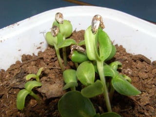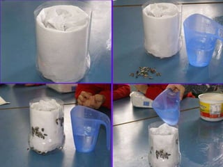 The document discusses a classroom experiment where students planted sunflower seeds in soil, paper towels, and various containers to observe plant growth over 4 days. The seeds began to sprout stems and leaves, and the students watched as the sunflowers and roots continued to grow with regular watering. They explored how sunflower seeds develop into plants when provided with the necessary requirements of soil, water, sun, and air.