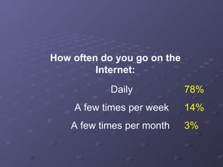 The document discusses the digital habits of students, focusing on their internet usage, the prevalence of cyberbullying, and its effects on young individuals. It highlights the tools and behaviors associated with cyberbullying, the challenges it poses for victims and schools, and provides recommendations for parents to support their children. Additionally, it emphasizes the importance of awareness and responsible internet use among students.