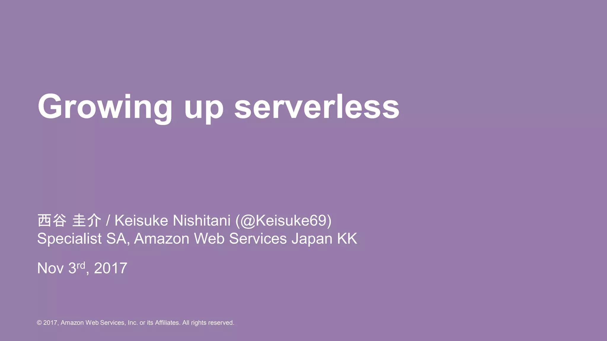 Web Services, Inc. or its Affiliates. All rights reserved. AWS Developers Meetup 開催します • 2017/12/07 夜 @ 目黒 AWS オフィス • 開発者の方向け、セッション形式のイベント • 内容のイメージ(予定) • DeveloperのためのライブAWSウォークスルー • ユースケースから見た実装カタログ 〜AWS逆引きリファレンス〜 • RESTful APIをChaliceで紐解く 〜Python Serverless Microframework for AWS〜 • Happy Hacking on AWS! • 申し込みはこちら https://pages.awscloud.com/DeveloperMeetup20171207.html