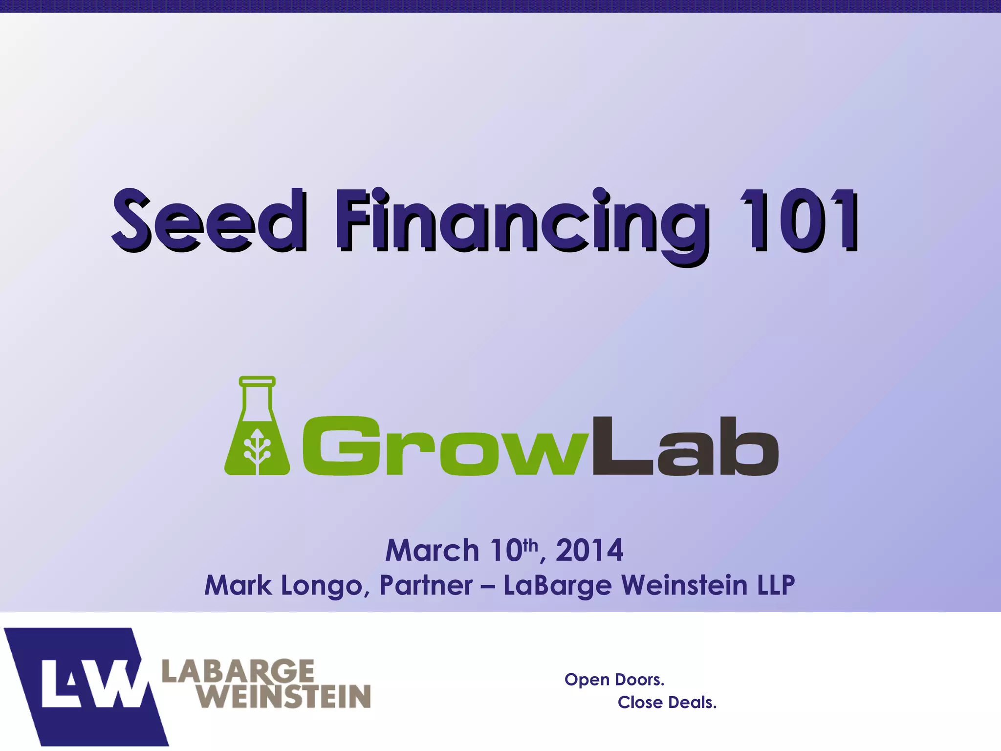 This document summarizes a presentation on seed financing structures for startups. It discusses common share equity, convertible debt, and preferred shares as options for seed financing. It also covers topics like capitalization tables, valuation, and terms of convertible notes from the Business Development Bank of Canada (BDC). Examples of capitalization tables are provided to illustrate how ownership is allocated for founders, investors, and option pools through different financing rounds.