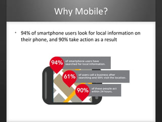 This document discusses why mobile experiences are important for small businesses. It notes that 94% of smartphone users look for local information on their phones and act on it. Having a mobile-friendly website or app allows businesses to connect with customers anywhere and drive more store traffic and leads. The document outlines 5 key reasons for small businesses to go mobile: to connect with customers, drive customers to stores, increase productivity, avoid lost business, and grow the business. It promotes a company called GrowMobile that helps businesses create mobile apps and websites.