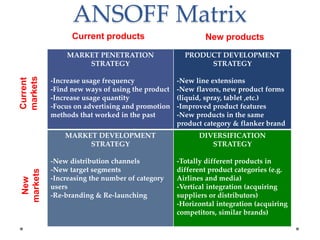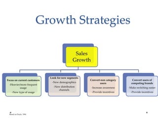 The document outlines several growth strategies for companies, including focusing on current customers to increase usage and find new uses, looking for new customer segments, and converting non-users and competitors' customers. It also discusses Ansoff's matrix of market penetration, product development, market development, and diversification strategies. Additionally, it covers blue ocean strategy of creating new markets without competition and value co-creation strategy of sharing resources and initiating dialogs with customers.