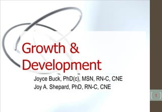 Growth and development principles, theories, and concepts are essential for nursing care of children. Principles include growth occurring at different rates in different parts of the body. Major theories discussed are Freud's psychosexual theory focusing on psychosexual development, Erikson's psychosocial theory addressing psychosocial tasks, Piaget's cognitive development theory outlining stages of cognitive growth, and Kohlberg's moral development theory. Nursing interventions should be based on understanding of children's developmental needs and abilities at different ages and stages.