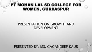 The document is a presentation on growth and development presented by Ms. Gagandeep Kaur at PT Mohan Lal SD College for Women in Gurdaspur. The presentation covers topics related to growth and development and was delivered to students at the women's college in Gurdaspur, Punjab.