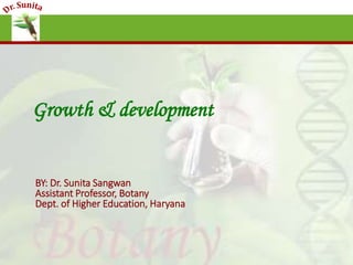 The document discusses the concepts of growth and development in living organisms, defining growth as an irreversible increase in size and mass, and development as the progressive changes throughout an organism's life cycle. It covers types of growth (primary and secondary), phases of growth, factors influencing growth, and differentiates between growth and development in terms of quantitative and qualitative changes. Additionally, it addresses cell differentiation, dedifferentiation, and the plasticity of plant development in response to environmental factors.