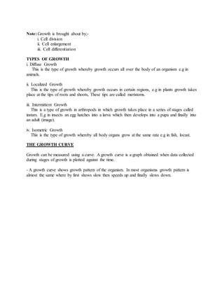 The document explains the concepts of growth and development in organisms, highlighting that growth is an irreversible increase in size and mass, while development involves changes in complexity and specialization of cells. It discusses factors affecting growth, including genetic makeup and environmental conditions, and differentiates between various types of growth and methods of measurement. Additionally, it covers the phases of mitosis and the significance of growth in both plants and animals, including human development stages.
