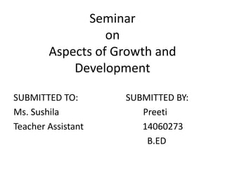 This document discusses various aspects of human growth and development, including physical, emotional, social, and cognitive development. It covers topics like the general pattern of physical growth, factors affecting development, Erikson's stages of psychosocial development, and Piaget's stages of cognitive development. Piaget's theory proposes that children progress through sensory-motor, pre-operational, concrete operational, and formal operational stages as their cognitive abilities develop. The document examines development from infancy through adolescence and adulthood.