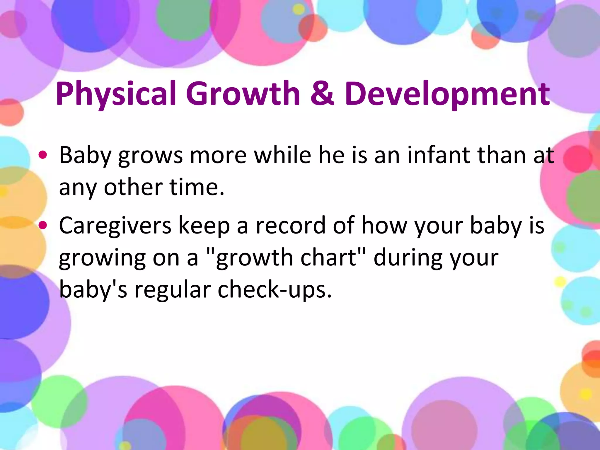 During the first year of life, infants experience significant physical, cognitive, linguistic, and emotional growth and development. Caregivers monitor an infant's physical growth through regular checkups and maintaining a growth chart. Infants develop motor skills and learn to grasp objects and sit up on their own. Establishing routines for sleeping, eating, and playtime is important for development. Infants begin to understand language and may say their first words by the end of the year. Their brains grow rapidly, so interaction and reading are encouraged over excessive TV time. Caregivers should ensure infant safety by maintaining a secure environment, using approved car seats correctly, and preventing hazards like choking, burns, and falls. When infants are sick or hospitalized