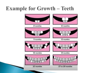Growth refers to increases in physical size, height, and weight, and is a quantitative and additive process. It is influenced by hereditary and environmental factors and stops at a particular point in life. Development, on the other hand, refers to qualitative changes that improve functional ability and occur across the lifespan through maturation and experience. Key differences between growth and development include that growth involves body changes while development involves orderly changes in character, and growth measures can be accurate while development involves subjective interpretation. Both nature and nurture influence human development, with nature determining genetic traits and nurture involving environmental experiences.
