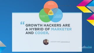 This document discusses growth hacking strategies for startups. It provides examples of successful growth hacks used by companies like Airbnb, Groupon, and Quora. Easy growth hacks mentioned include gaining social validation through a user's friends on Facebook, using waiting lists to generate interest, and incentivizing users to add multiple email addresses. More difficult growth hacks involve integrations with other services, referrals rewards, and embedding content. The document also discusses metrics like CAC, customer lifetime value, and LTV that are important for SaaS companies. It provides tips on user activation testing and tracking user behavior and interactions through analytics. Finally, it emphasizes the importance of social validation, not changing user habits significantly, and