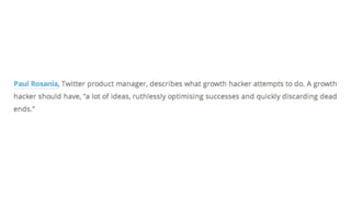 Growth hacking involves constant testing, optimization, and experimentation across multiple online channels and properties to drive growth. It is an iterative process that begins with setting up analytics to establish baselines and monitor key performance indicators. Growth hackers then explore different user acquisition strategies, focusing on conversion rate optimization techniques like A/B testing. The goal is to efficiently move users through the funnel and identify the combinations of ideas, content, and campaigns that are most effective at acquiring and retaining users over the long run. It requires ongoing testing and assessment to refine strategies and ensure growth efforts remain aligned with business goals.
