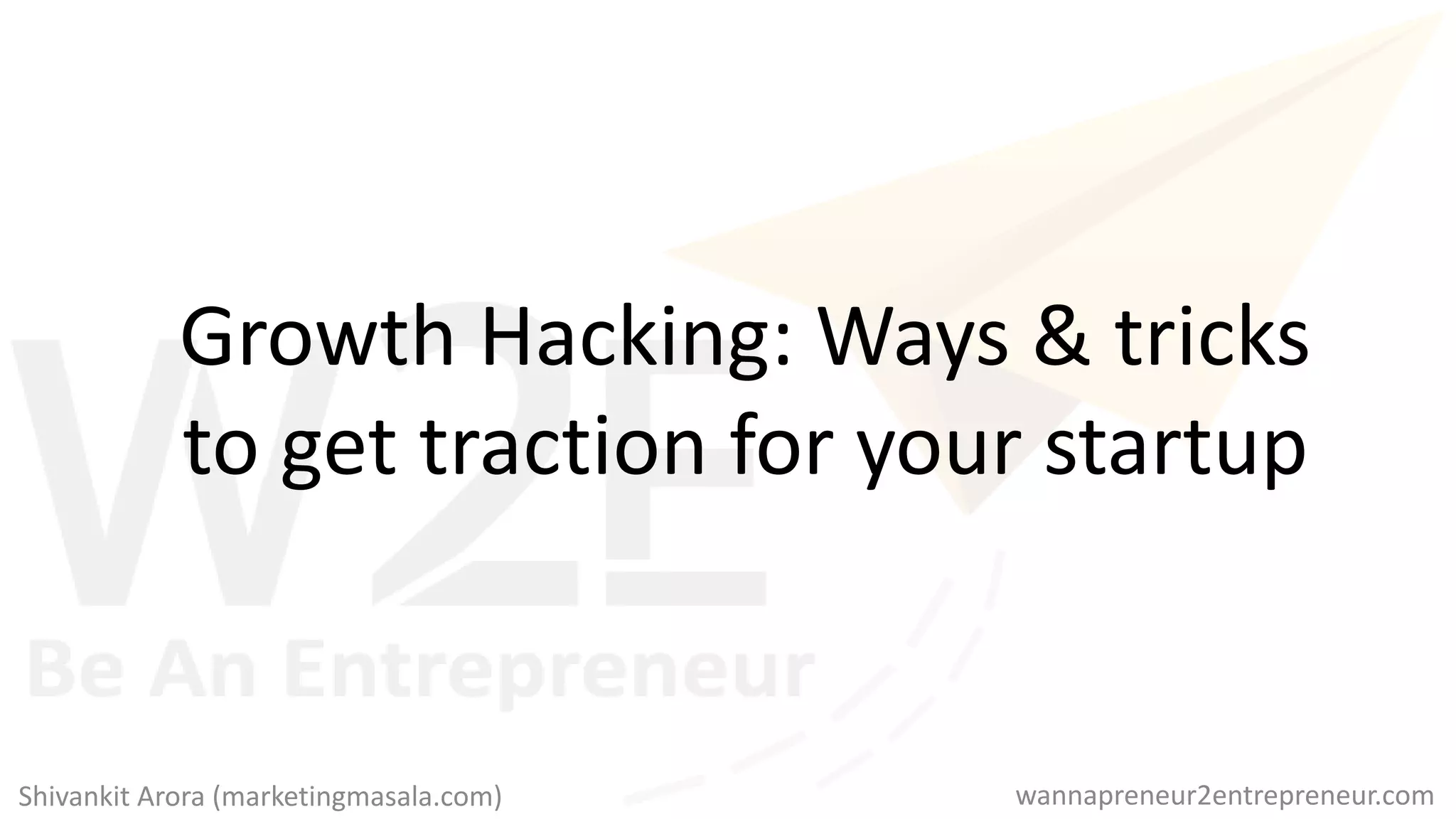 The document discusses growth hacking as a strategic approach to rapidly gain traction for startups by utilizing cost-effective marketing techniques. It outlines a growth hacking funnel (AARRR) comprising stages of awareness, activation, retention, referral, and revenue, and emphasizes the importance of defining relevant marketing channels for customer engagement and optimizing efforts through continuous analysis. Key takeaways include the need for a defined marketing process, regular performance evaluations, and the use of analytics tools to inform growth strategies.