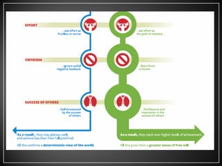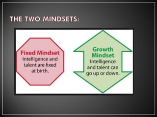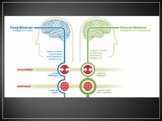 This document discusses the differences between a fixed mindset and a growth mindset. A fixed mindset believes that talents and abilities are innate and cannot change, while a growth mindset believes that abilities can be developed through effort and learning. The document provides examples of how those with a growth mindset, such as Einstein, Jordan, and Disney, were able to achieve success through perseverance and hard work despite challenges and criticism. It emphasizes that the brain can grow new connections through learning and that viewing challenges as opportunities to improve, rather than threats to self-worth, is an important distinction between these two mindsets.