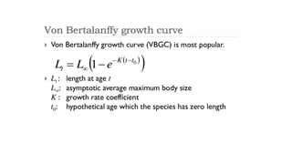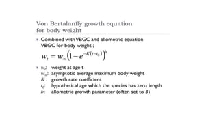 1. Von Bertalanffy's growth equation is commonly used to model fish growth and estimate growth parameters.