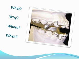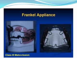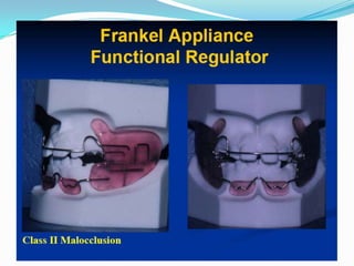 The document discusses different types of functional appliances used in orthodontics including simple functional appliances like lip bumpers and oral screens, as well as more complex removable appliances like the Frankel regulator, Bionator, activator, and twin block. It describes the indications, contraindications, components, and mechanics of several commonly used functional appliances. The document emphasizes that functional appliances aim to alter the neuromuscular environment and utilize muscle forces to effect skeletal and dental changes.