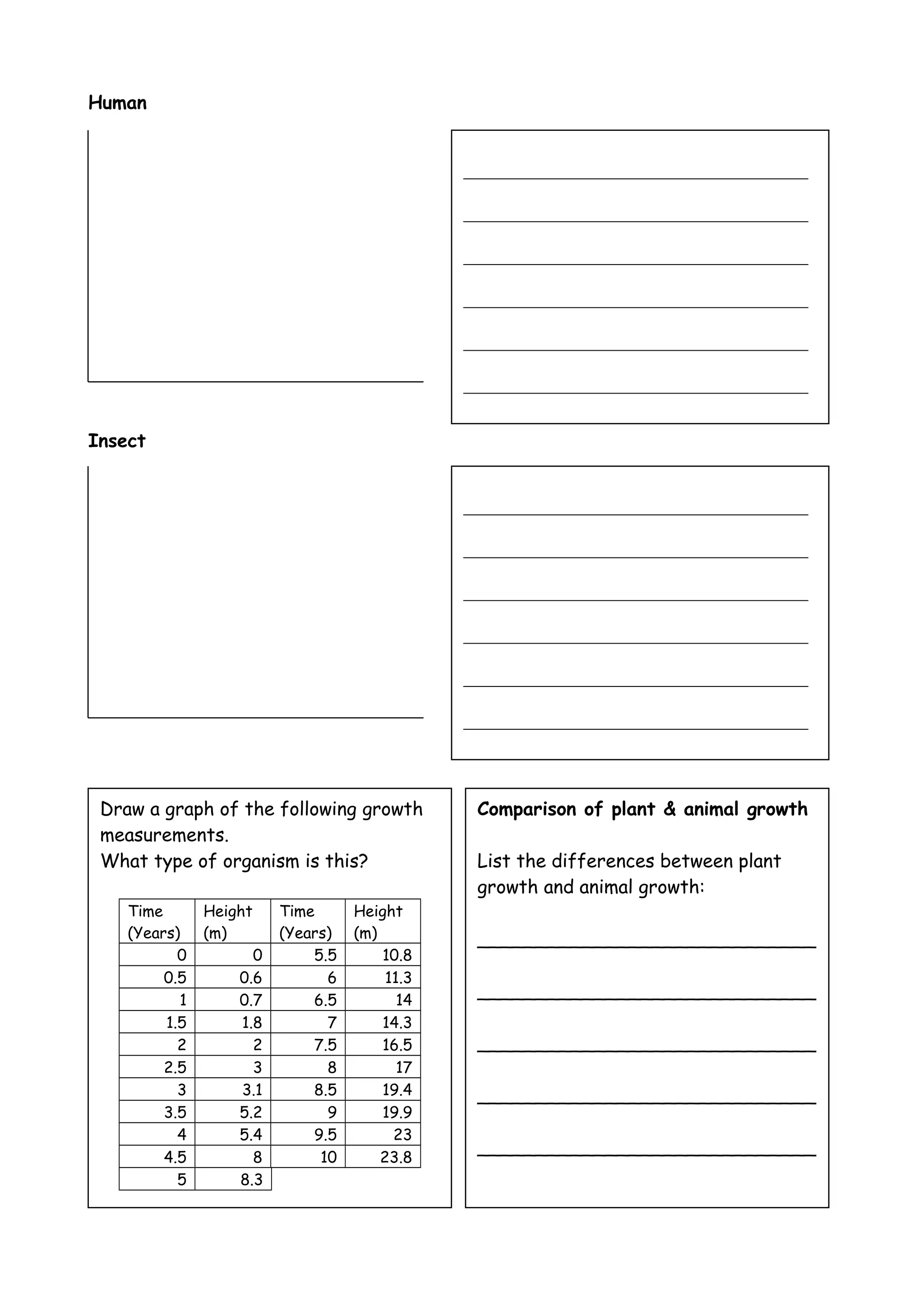 This document discusses growth patterns of different organisms and includes examples of growth curves for an annual plant, perennial plant, insect, and a graph showing height measurements over time for an unspecified organism. Readers are asked to identify the type of organism for the given growth graph and list differences between plant and animal growth.