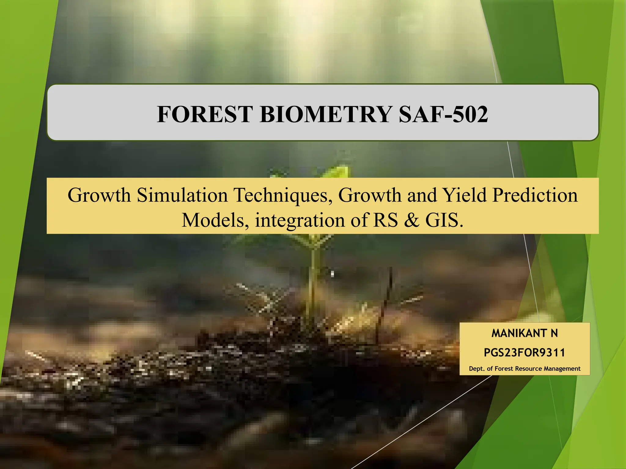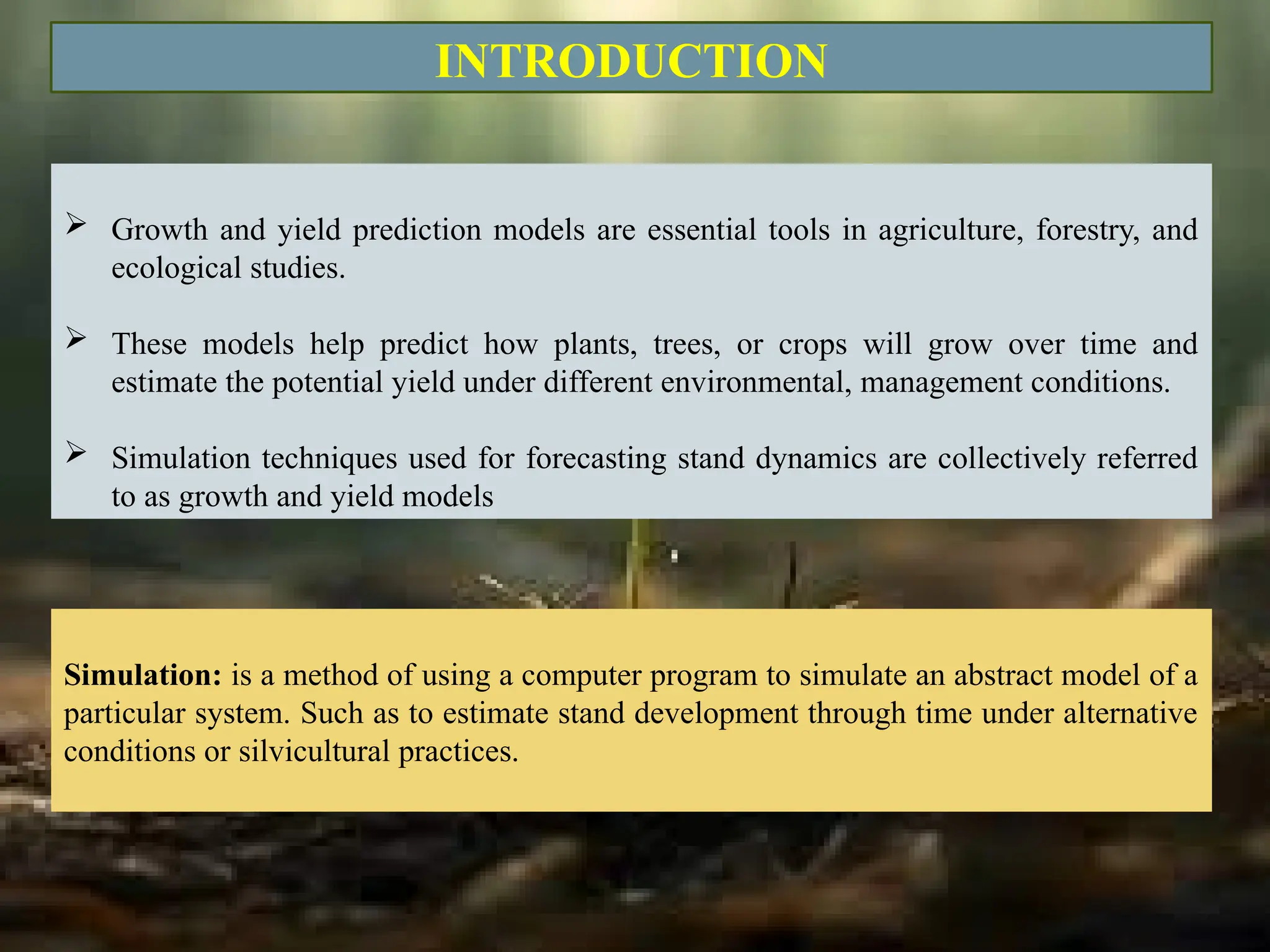 The document discusses growth simulation techniques and yield prediction models utilized in agriculture and forestry, highlighting their importance in estimating plant and crop growth under variable conditions. It outlines different types of models, such as whole stand models and individual tree models, along with the integration of remote sensing and GIS technologies in data collection and analysis. Furthermore, it addresses challenges in modeling, future directions for improvements, and the role of advanced simulation methodologies in forest management practices.