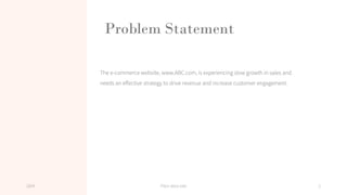 The document outlines a growth strategy for the e-commerce website abc.com, aimed at driving sales growth and increasing customer engagement. It identifies current challenges such as low revenue, poor conversion rates, and user acquisition difficulties while proposing initiatives such as targeted marketing campaigns, user experience enhancements, and strategic partnerships. The strategy includes key metrics for tracking success and addresses risks with mitigation plans to ensure effective implementation.