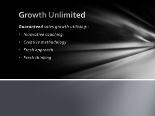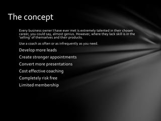 The document details a sales coaching program designed to help business owners enhance their selling skills and increase sales through various innovative and creative methods. It offers three levels of membership (Silver, Gold, Platinum), each providing different access to coaching, workshops, and discounts. Membership is flexible, allowing members to choose their level of involvement and can be ended with just one month's notice.