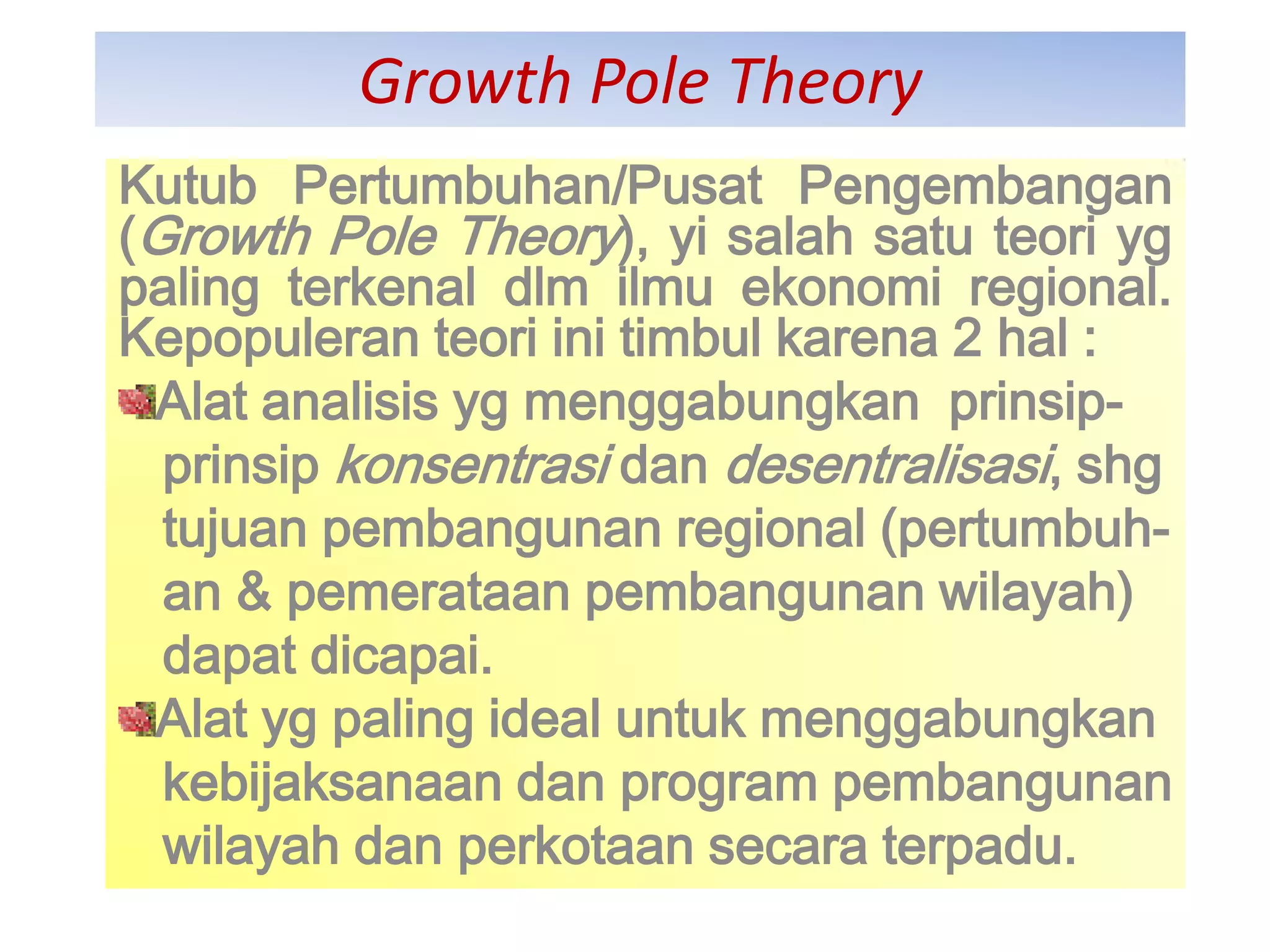Teori kutub pertumbuhan menjelaskan bagaimana konsentrasi industri di lokasi tertentu dapat mendorong pertumbuhan ekonomi regional serta pemerataan pembangunan. Konsep ini menunjukkan bahwa industri-industri utama dapat meningkatkan perkembangan daerah sekitarnya, namun juga dapat menyebabkan polarisasi sumber daya dan masalah lingkungan. Efek aglomerasi, seperti keuntungan skala dan lokalisasi, menjadi penting meskipun dihadapkan pada tantangan seperti kerugian aglomerasi yang dapat muncul seiring dengan pertumbuhan populasi dan kegiatan ekonomi.