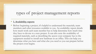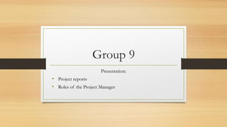 The document discusses the roles and responsibilities of a project manager. It outlines 7 types of project management reports including availability, status, project health, risk assessment, time management, project baseline, and summary reports. It then describes 6 key responsibilities of a project manager: planning, organizing, leading, monitoring, communicating, and managing risk. Finally, it analyzes a project manager's roles using Mintzberg's management theory, outlining the interpersonal, informational, and decisional roles of figurehead, leader, liaison, monitor, disseminator, spokesperson, entrepreneur, disturbance handler, and negotiator.