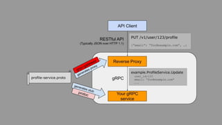 The document discusses REST and gRPC APIs. It describes REST as a design pattern that uses HTTP and represents resources with JSON or XML. While REST is widely used, it has disadvantages like bloated data payloads and lack of a formal contract. gRPC is introduced as an alternative that is high performance, uses protocol buffers for compact payloads, and has generated client/server code in many languages. The document also describes how grpc-gateway can be used to expose existing gRPC services through a RESTful JSON API via HTTP to support existing clients.