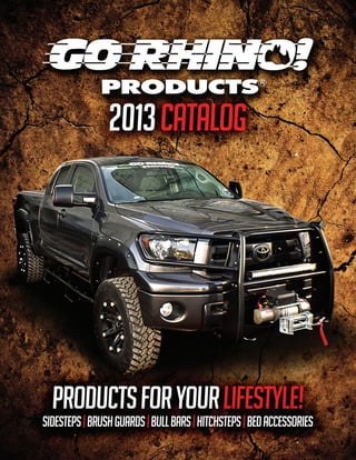 The document discusses several models of sidesteps manufactured by Dominator for trucks. It includes details on 6 different sidestep models: the D4 Cab Length Dual-Step, D3 One-Piece Wheel-to-Wheel, D3 Modular Wheel-to-Wheel, D2 Cab Length, and mounting brackets that fit most full-size trucks from Chevrolet, GMC, Dodge, and Ford. The sidesteps come in various materials, lengths, and finishes and include slip-resistant step pads for safety.