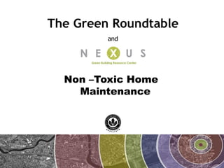 The document discusses green and non-toxic home maintenance. It begins by asking how readers can improve indoor air quality, minimize risks from existing building products and systems, reduce use of toxic chemicals, and address naturally occurring hazards in the home. It then discusses the "triple bottom line" of people, planet and prosperity. Several sobering facts about environmental hazards and health risks are presented. Sources of danger in the home from various products, materials and infiltration are outlined. Associated health risks are described. The document provides information on assessing risks from commercial products and finding safer alternatives. It discusses general strategies for addressing risks and rules of thumb for safer product use. Finally, it presents green cleaning recipes using common household ingredients.