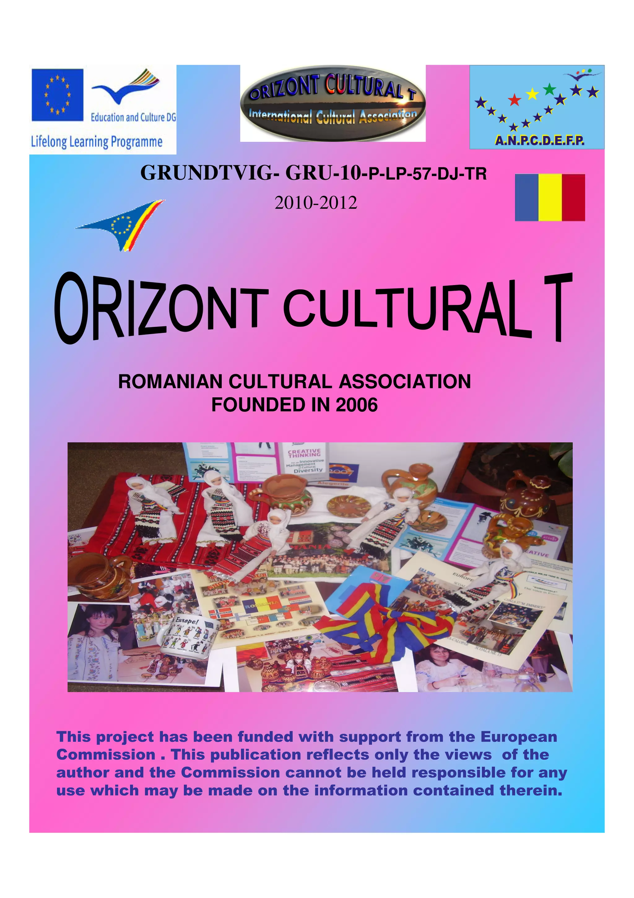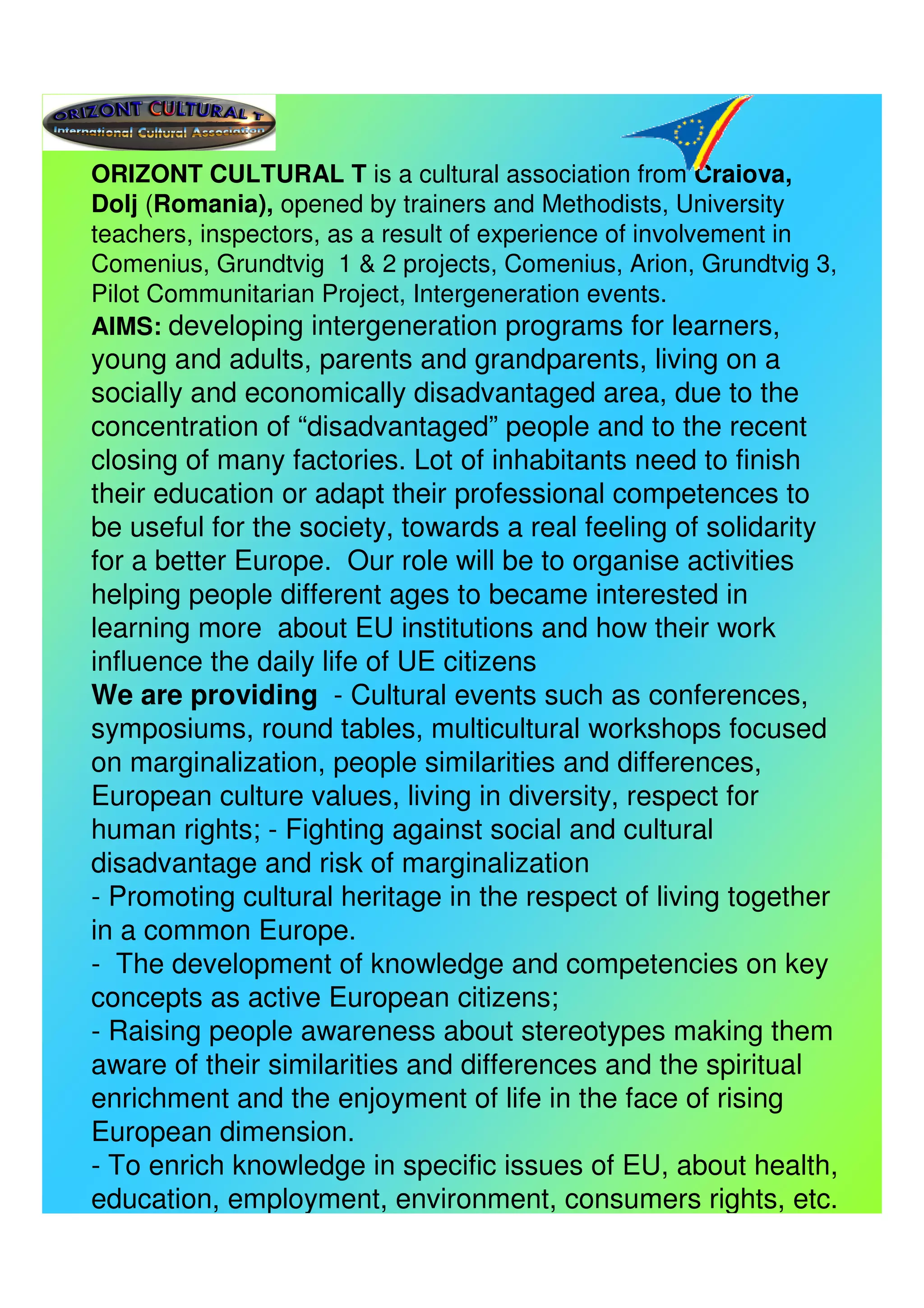 This document summarizes the activities of the Romanian Cultural Association Horizon Cultural T, founded in 2006. It organizes cultural events and educational programs with the goals of promoting European cultural values, fighting social disadvantage, and raising awareness of issues in the EU. Some of its projects include ones focused on audiovisual languages for young adults, intergenerational solidarity in Portugal, and integrating adults through music in Turkey. It involves learners of all ages in programs about European citizenship, cultural diversity, and developing international connections. Horizon Cultural T also participates in the Comenius Regio network through the Dolj County Council in Romania.