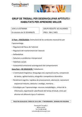 - Estratègies per l’aprenentatge: recursos metodològics , síntesi de la informació, organització i planificació del temps d’estudi, eines per afrontar els diferents tipus d’ exàmens