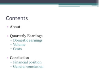 Grupo Modelo is a Mexican brewing company founded by Alonso Gomez and Federico Cisneros that produces popular export brands like Corona, Modelo, and Pacifico. Corona Extra is the top selling beer in Mexico and a top 5 brand worldwide, available in over 150 countries. While Grupo Modelo dominates the Mexican market with local brands, this document discusses the company's quarterly earnings, costs, financial position, and concludes that it has shown a growing trend and stable financials.