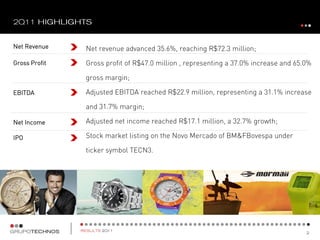 - Net revenue for Technos S.A. advanced 35.6% to R$72.3 million in 2Q11 and 41.5% to R$119.2 million in 1H11.