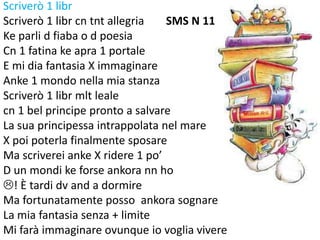 Il documento presenta una serie di componimenti poetici ispirati alla lettura e alla fantasia, esprimendo la gioia di scrivere storie di fiabe e avventure. Tra i temi trattati ci sono la libertà di sognare, l'importanza della lettura e la creazione di mondi incantati. Viene citato anche il personaggio di Jonathan Livingston, simbolo di chi viaggia senza meta e vive oltre le convenzioni.