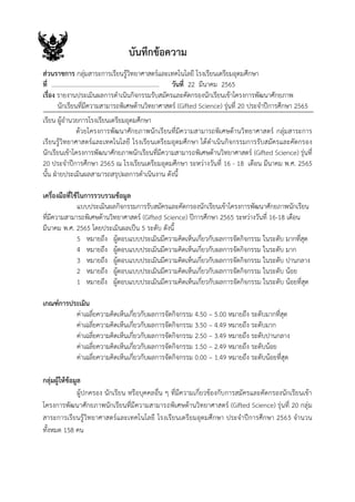 รายงานประเมินผลการดำเนินกิจกรรมรับสมัครและคัดกรองนักเรียนเข้าโครงการพัฒนาศักยภาพนักเรียนที่มีความสามารถพิเศษด้านวิทยาศาสตร์ (Gifted Science) รุ่นที่ 20 ประจำปีการศึกษา 2565