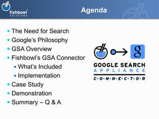 The document discusses the integration of Google Search Appliance (GSA) with Oracle UCM by Fishbowl Solutions, emphasizing the necessity of search for productivity and efficient information retrieval. It highlights the features of GSA, including its ability to search across various content types and the advantages of the Fishbowl connector for Oracle UCM. The document also details a case study illustrating the improved website experience and search functionality provided by this integration.
