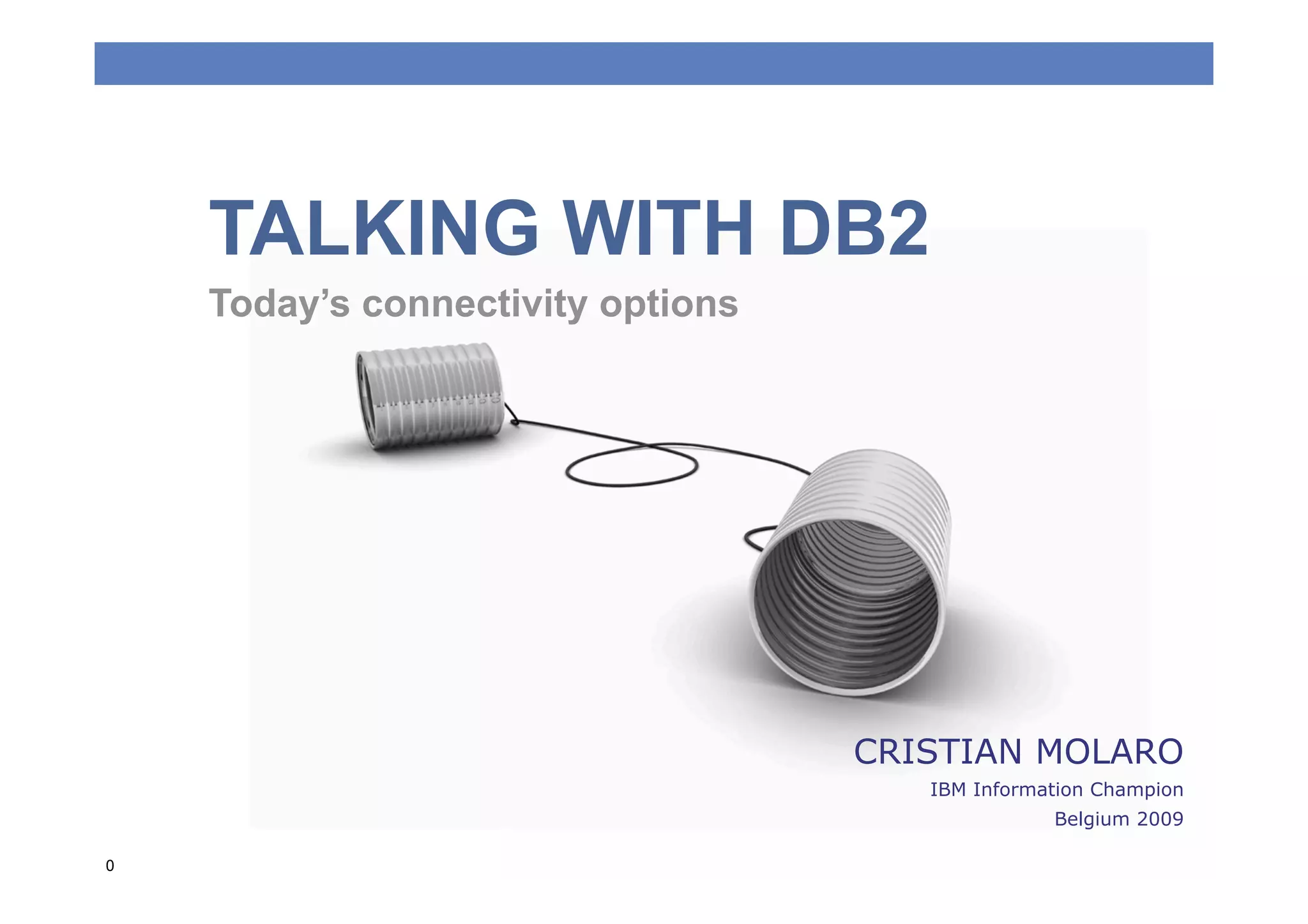 The document discusses connectivity options for talking with DB2, including DB2 Connectivity drivers, clients, and protocols. It provides an overview of DB2 connectivity drivers for JDBC, ODBC, CLI, and .NET, and how they map to older versions. Guidelines are given for selecting the right driver based on application needs and considerations around footprint, performance, high availability features, and workload balancing. The roles of DB2 Connect and connectivity protocols like DRDA, private protocol, and hipersockets are also summarized.