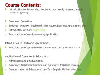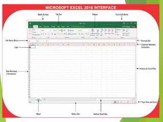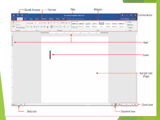 The document provides information about Microsoft Word, including its interface and common features. The interface includes tabs, ribbons, a title bar, ruler, and cursor. It describes the Quick Access toolbar, tab bar, ribbons, groups within ribbons, and basic control buttons. Common word processing features like editing text, formatting, and printing are also mentioned.