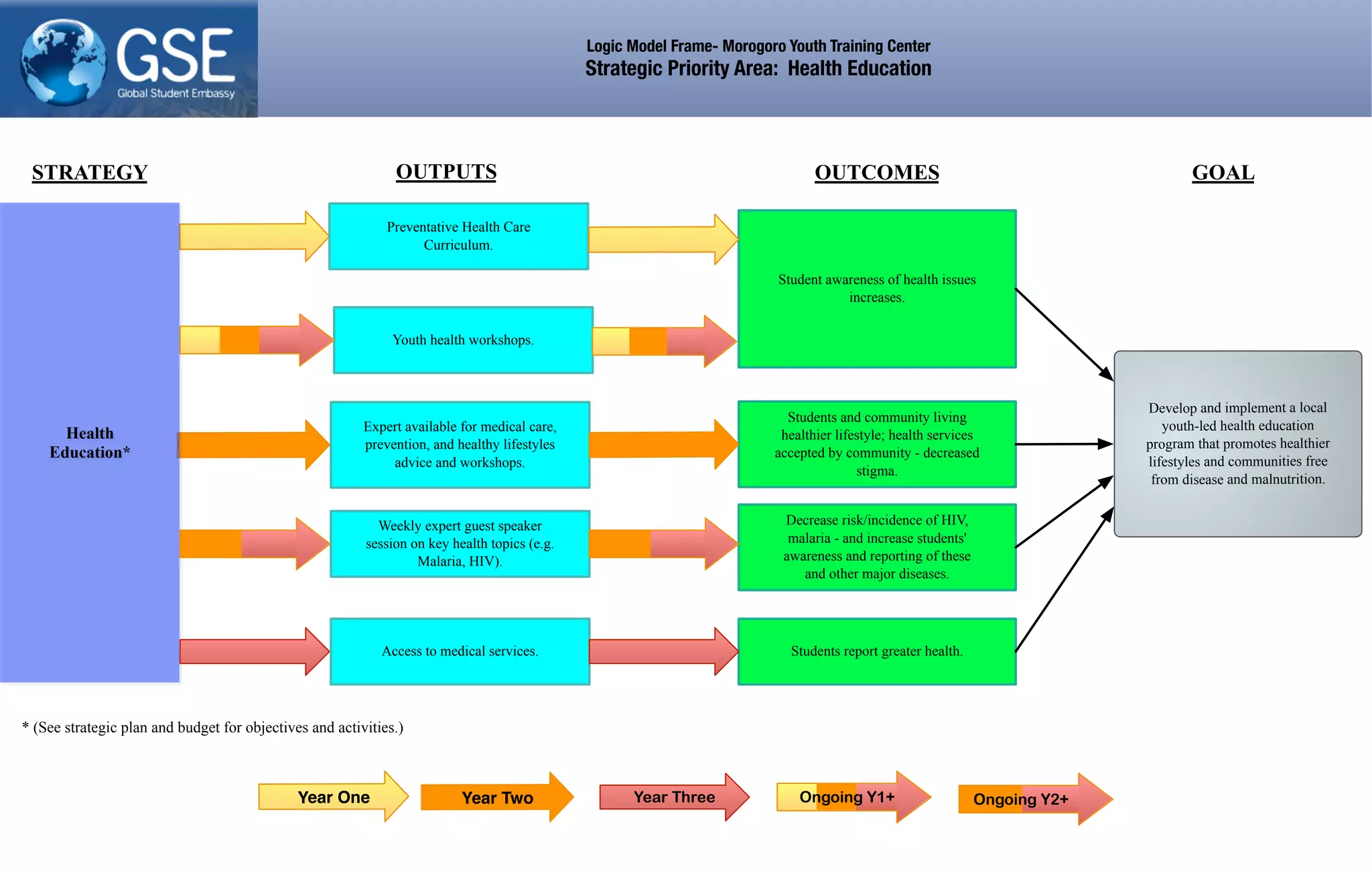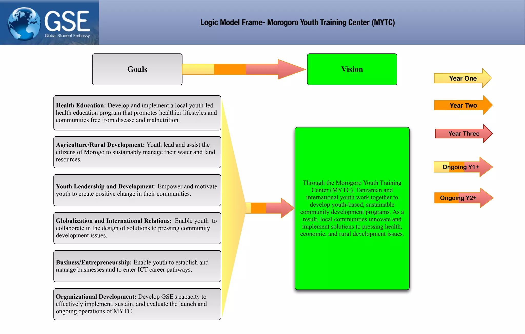The document outlines a logic model for the Morogoro Youth Training Center (MYTC) in Tanzania. The MYTC aims to empower local youth to drive community development through six strategic priority areas: health education, agriculture/rural development, youth leadership, globalization, entrepreneurship, and organizational development. It details goals, strategies, outputs, and outcomes for each priority area over three years and beyond. The overall vision is for Tanzanian and international youth to collaborate through the MYTC to develop and implement sustainable community development programs that address health, economic, and rural issues in local communities.