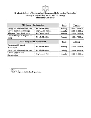 This document provides a tentative timetable of courses for postgraduate programs in various specializations at Hamdard University for Spring 2013. It lists courses for MS, ME and PhD programs in Electrical Engineering with specializations in Control and Automation, Communication Systems and Networks, and Electronics Engineering. It also lists courses for MS and PhD programs in Computer Science with a specialization in Computer and Communication Networks. Additionally, it provides the course schedule for MS programs in Computer Science with a specialization in Software Engineering, Energy Engineering, and Energy and Environment. The timetable specifies the course name, instructor, meeting days and timings for each course. It is signed by the Chairman of the Postgraduate Studies Department at Hamdard University's Faculty