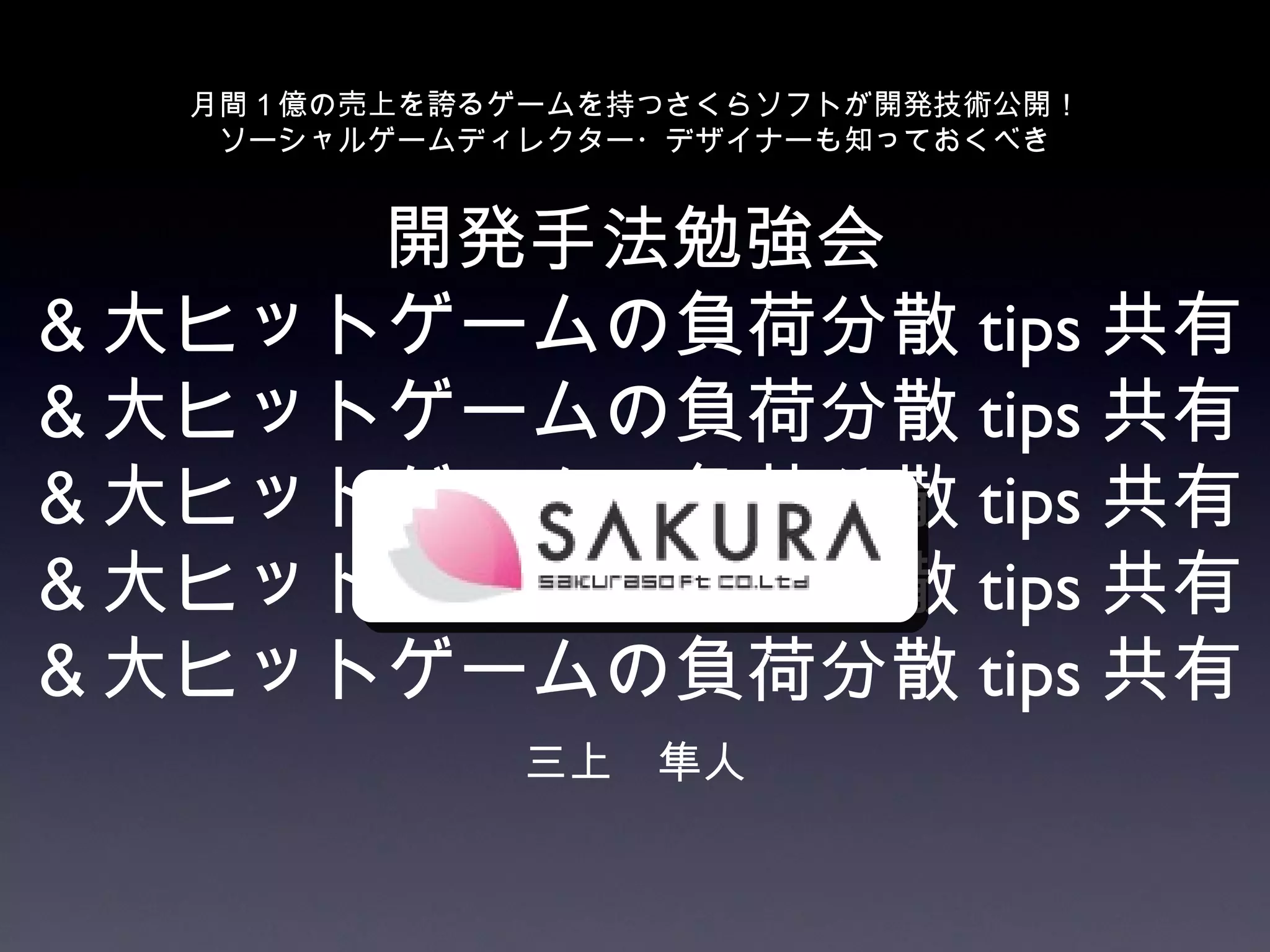 GSGL 2012 で、さくらソフトが発表に使用した資料です。 月間1億の売上を誇るゲームを持つさくらソフトが開発技術公開! ソーシャルゲームディレクター・デザイナーも知っておくべき 開発手法勉強会 &大ヒットゲームの負荷分散tips共有