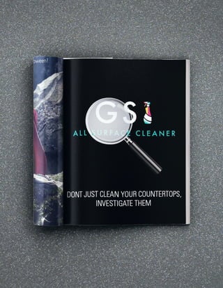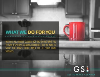 This document summarizes the benefits of GSI All Surface Cleaner. It claims the cleaner shows users what germs and bacteria are removed from surfaces so they can live a cleaner and healthier life. It also promises to prevent future health risks by killing 99% of germs 100% of the time, providing a safer alternative to bleach. The cleaner is described as a "detective in a bottle" that allows users to investigate their surfaces beyond just cleaning them.