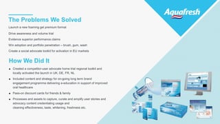 The document outlines a campaign to launch a new premium foaming gel product in EU markets through advocacy and social activation. It created a home trial toolkit that was locally activated in the UK, Germany, France and Netherlands to generate brand engagement. This included content for ongoing education support, pass-on discount cards, and processes to capture user stories and advocacy content. The campaign distributed 10,000 trial kits and 200,000 discount cards, generating over 4 million brand recommendations and 15.7% sales uplift of the target SKU in Germany via word-of-mouth advocacy. An analysis showed the overall brand benefited from a 7.1% positive impact and increased awareness brought new customers and items to the brand.