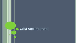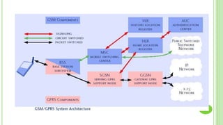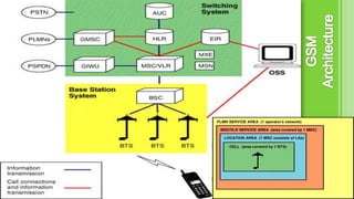 The document outlines the architecture and subsystems of GSM (Global System for Mobile Communication), detailing its hierarchical network structure comprising the Mobile Station (MS), Base Station Subsystem (BSS), and Network and Switching Subsystem (NSS). It explains the roles of various components, including MSC, HLR, VLR, and BTS, and discusses call processing, location updates, and handover procedures. Additionally, it highlights security features and introduces GPRS for packet-switched services, emphasizing GSM's flexibility and user choices in mobile communication technology.