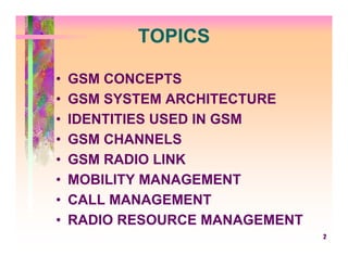 The document discusses the Global System for Mobile (GSM) communications, including an overview of GSM concepts, system architecture, identities and channels used, the radio link, mobility and call management, and radio resource management. It provides background on the development of GSM standards and specifications. The document also covers topics like GSM network structures, frequency bands, channel access techniques, and mobility functions like timing advance.