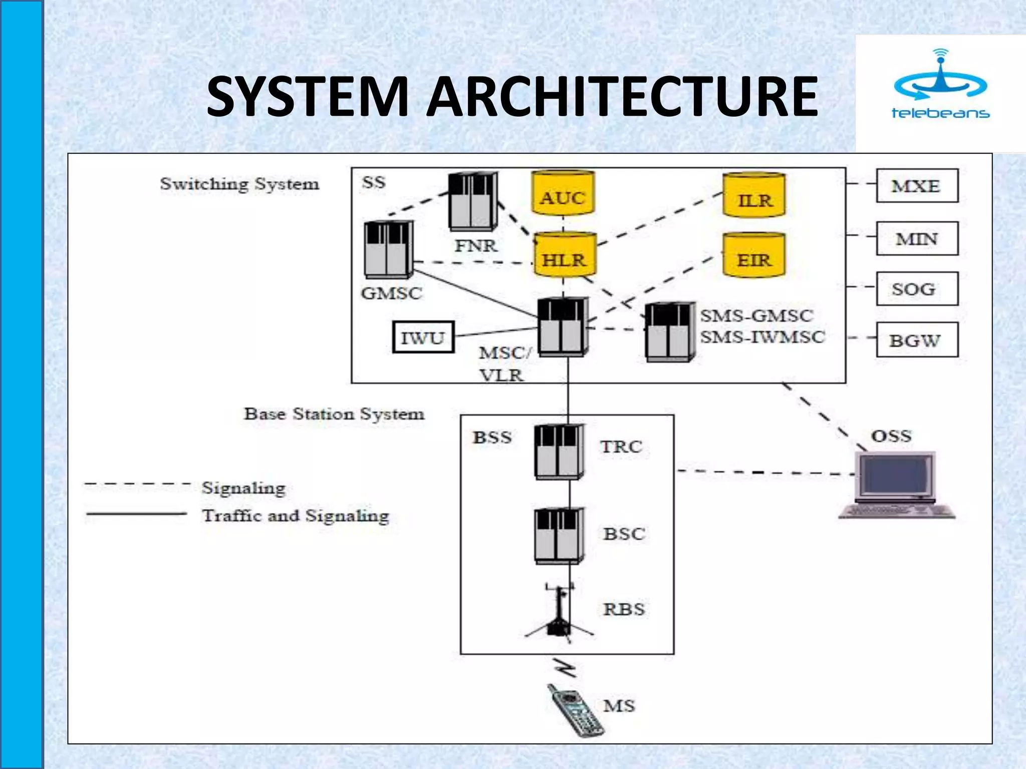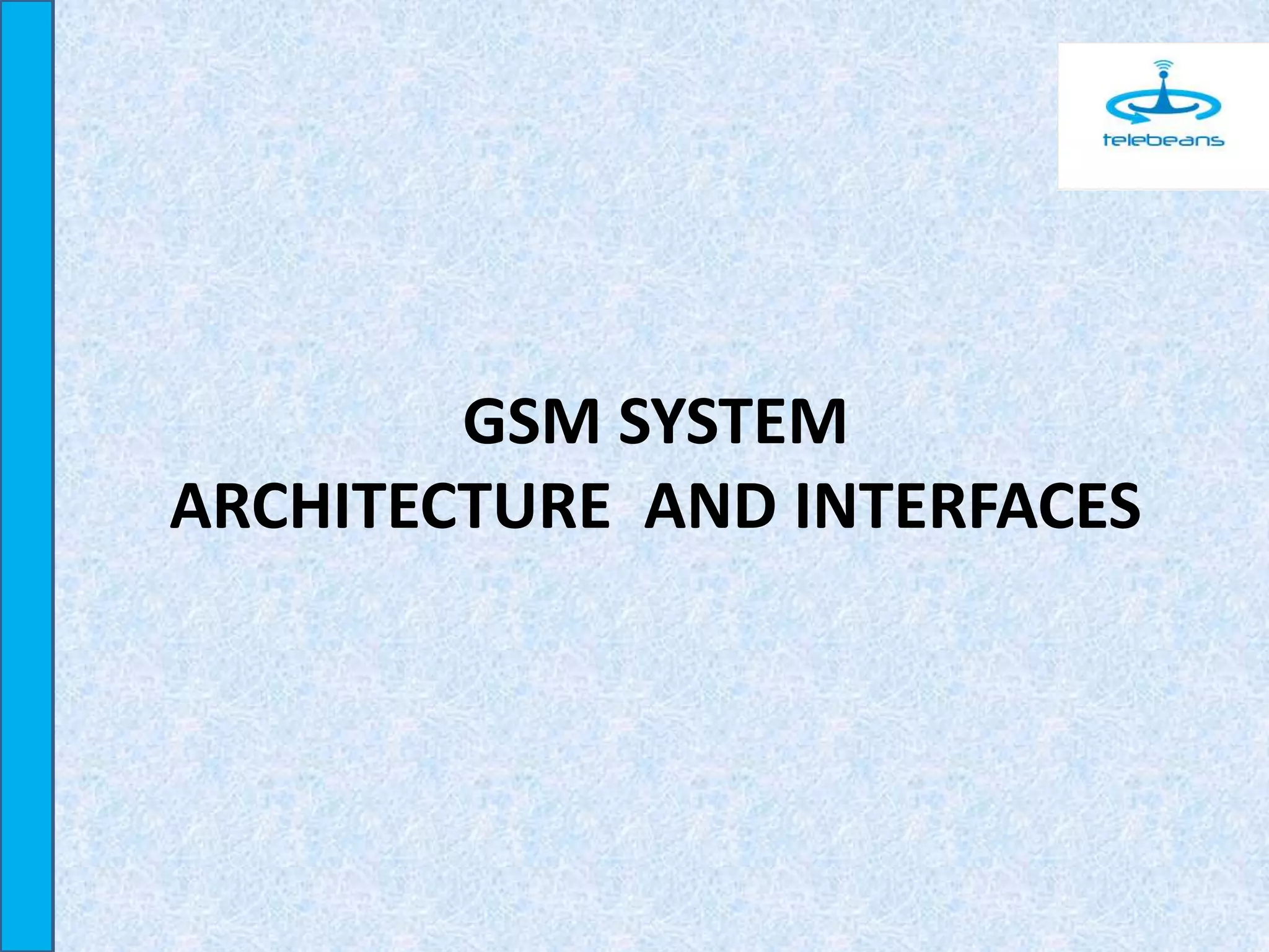 The GSM system architecture is divided into three major systems: the Switching System (SS), the Base Station System (BSS), and the Operation and Support System (OSS). The SS handles call processing and subscriber functions and includes the MSC, HLR, VLR, and other registers. The BSS handles radio functions and includes the BSC and BTS. The OSS manages errors, configuration, faults, and performance across the network. Key interfaces include the A interface between MSC and BSS, the B interface between MSC and VLR, and the Um interface between MS and BTS.