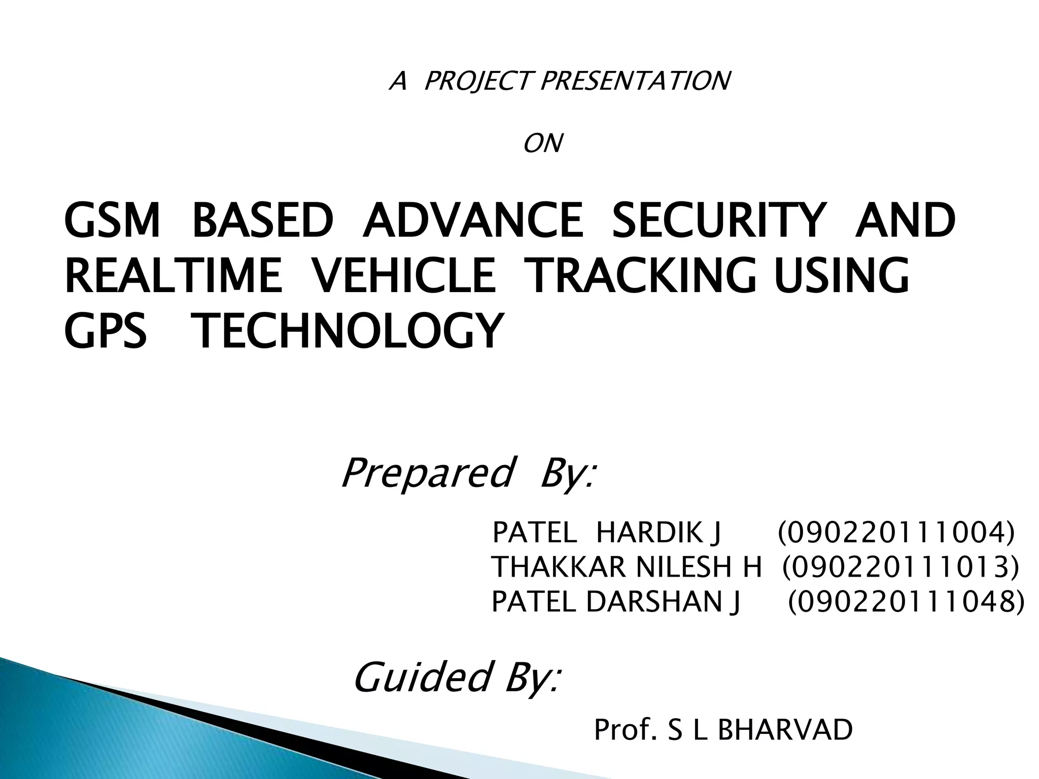 The document outlines a project presentation for a GSM-based advanced security and real-time vehicle tracking system utilizing GPS technology, prepared by students at the Government Engineering College, Patan. The project aims to enhance vehicle security through two-way communication between the alarm system and the vehicle owner, and provides remote control features and real-time tracking capabilities. Key components include a microcontroller, GSM modem, and GPS receiver, with applications in vehicle and animal tracking, and alerts for stolen vehicles.