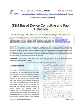 The document presents a project utilizing GSM technology for controlling and monitoring electrical devices remotely via SMS, allowing users to manage up to eight devices. It details the components used, including the AT89C52 microcontroller and GSM SIM900A modem, and explains the process of sending commands and receiving feedback regarding device status and faults. The system enhances user convenience compared to traditional remote controls by overcoming range limitations.