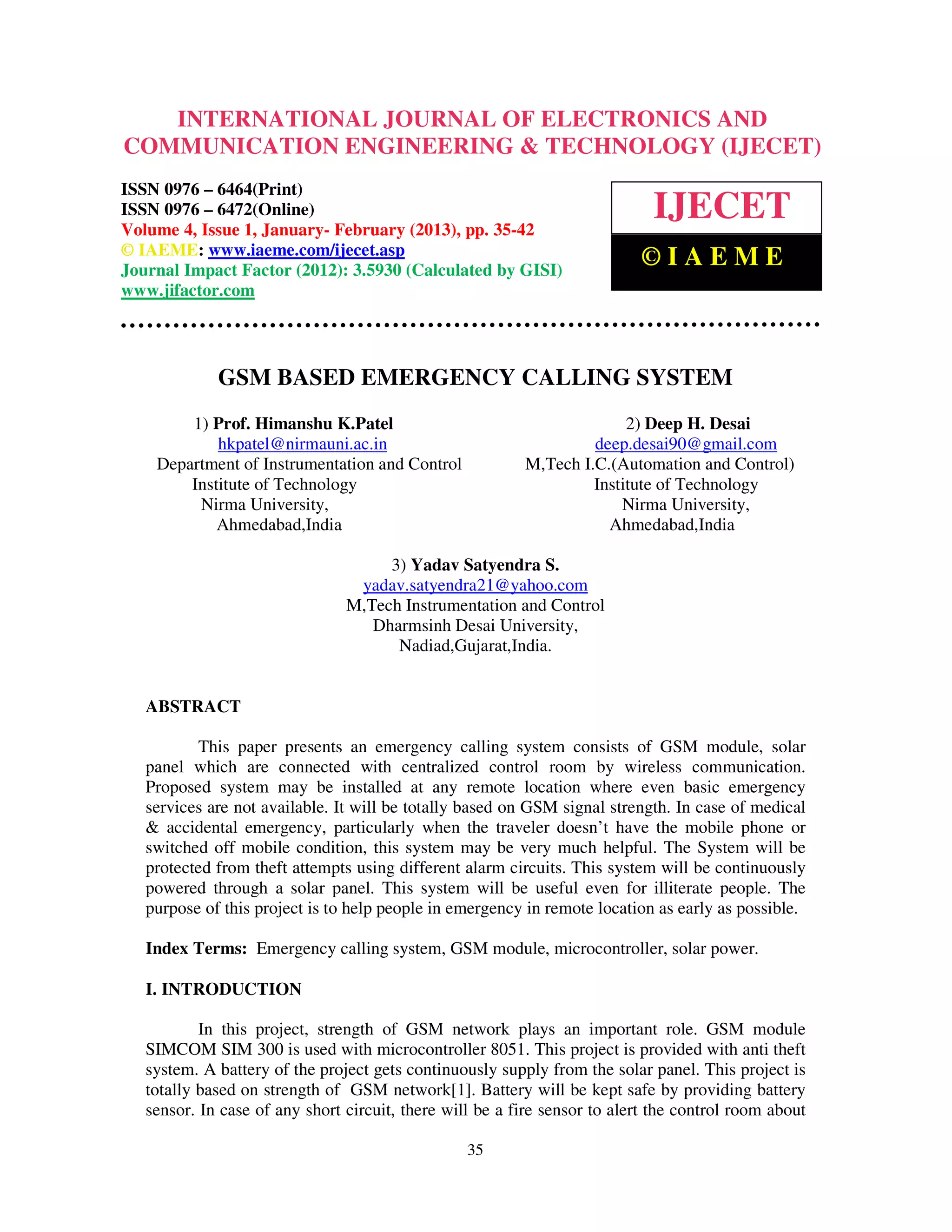 This document summarizes a research paper on an emergency calling system using GSM technology. It describes a system that includes a GSM module, microcontroller, solar panel, battery, and sensors. The system is intended to be installed in remote locations without emergency services to allow users to call for help. It operates using GSM cellular signals and is powered by a solar-charged battery. Sensors can detect fires, theft attempts, and vibrations in order to alert emergency responders. The document provides details on the system components, programming, and how the system would function to allow even illiterate users to call for assistance in emergency situations.