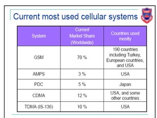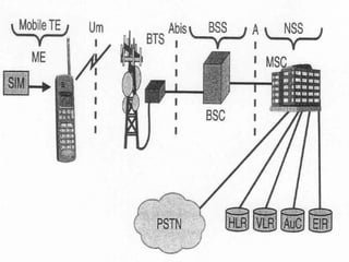 GSM (Global System for Mobile communications) is a digital cellular network developed to provide improved spectrum efficiency, international roaming, and compatibility with other networks. It uses TDMA to allow multiple users to access the same radio frequency channel at different time slots. The GSM architecture consists of mobile stations, a base station subsystem including base transceiver stations and base station controllers, and a network subsystem including mobile switching centers and databases like the home location register.